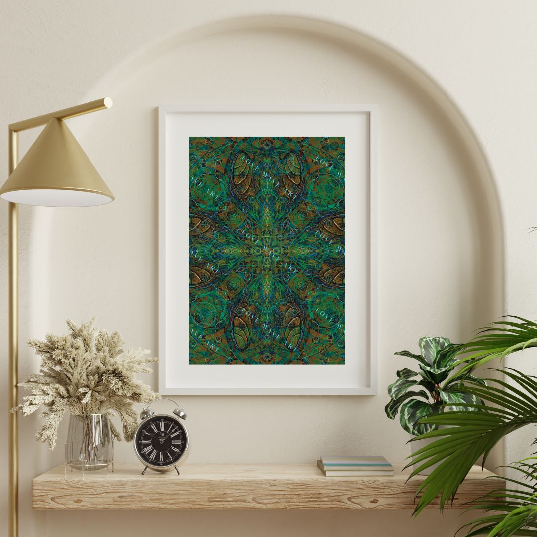 The design showcases the sense of pride of a peacock, combined with the elegance of aquatic life, through a blend of flowing patterns and luminous tones. It is an absolute example of abstract art inspired by nature, making it a captivating choice for lovers of Abstract art prints and those seeking modern art to buy, filled with energy and excitement, yet balanced with calmness.
